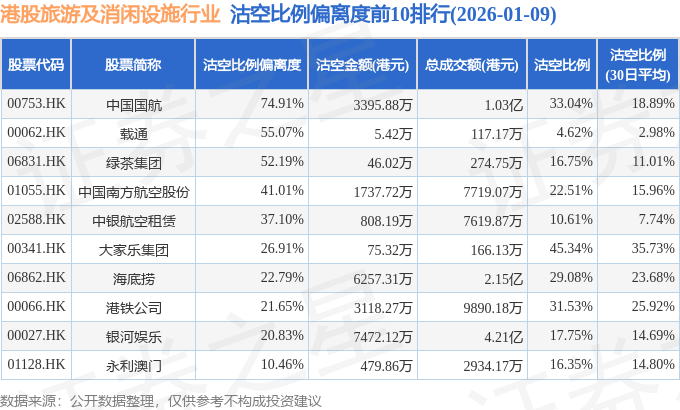 由于港股人民币柜台交易股票成交金额较小,沽空比例普遍偏高,为了避免干扰,已将人民币柜台交易股票从排行表格中剔除。
