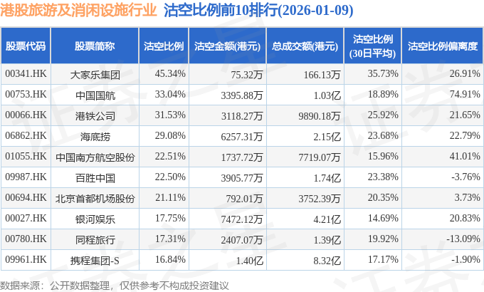 从沽空比例来看,大家乐集团、中国国航、港铁公司沽空比例位居行业前三,分别为45.34%、33.04%、31.53%。
