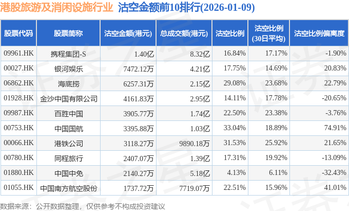 从沽空金额来看,携程集团-S、银河娱乐、海底捞沽空金额位居行业前三,分别为1.4亿港元、7472.12万港元、6257.31万港元。