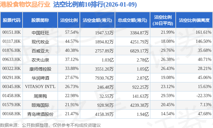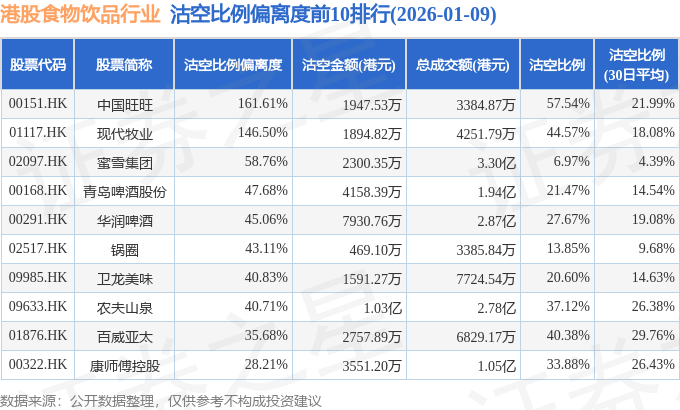 从沽空比例来看,中国旺旺、现代牧业、百威亚太沽空比例位居行业前三,分别为57.54%、44.57%、40.38%。