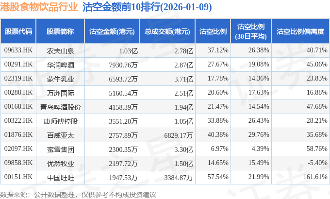 从沽空金额来看,农夫山泉、华润啤酒、蒙牛乳业沽空金额位居行业前三,分别为1.03亿港元、7930.76万港元、6593.72万港元。