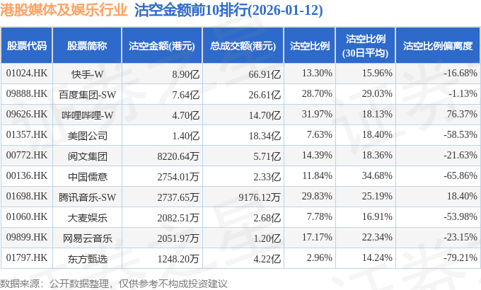 从沽空金额来看,快手-W、百度集团-SW、哔哩哔哩-W沽空金额位居行业前三,分别为8.9亿港元、7.64亿港元、4.7亿港元。