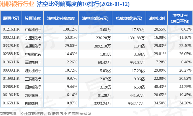 从沽空比例偏离度来看,中原银行、东亚银行、交通银行沽空比例偏离度位居行业前三,分别为138.12%、53.01%、29.6%。