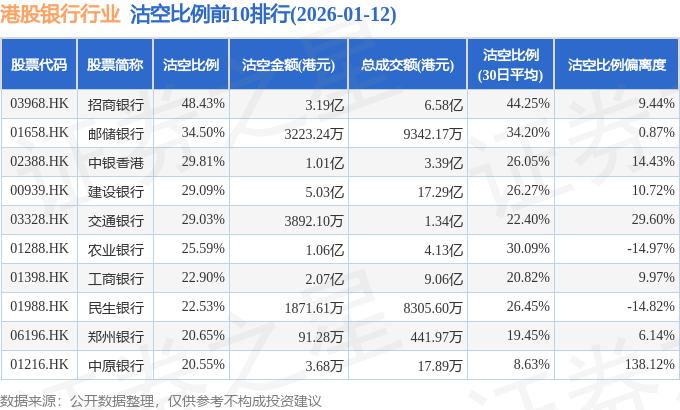 从沽空比例来看,招商银行、邮储银行、中银香港沽空比例位居行业前三,分别为48.43%、34.5%、29.81%。