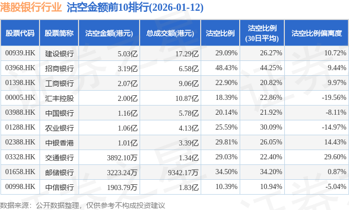 从沽空金额来看,建设银行、招商银行、工商银行沽空金额位居行业前三,分别为5.03亿港元、3.19亿港元、2.07亿港元。
