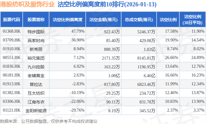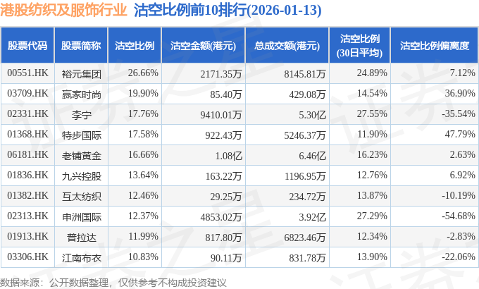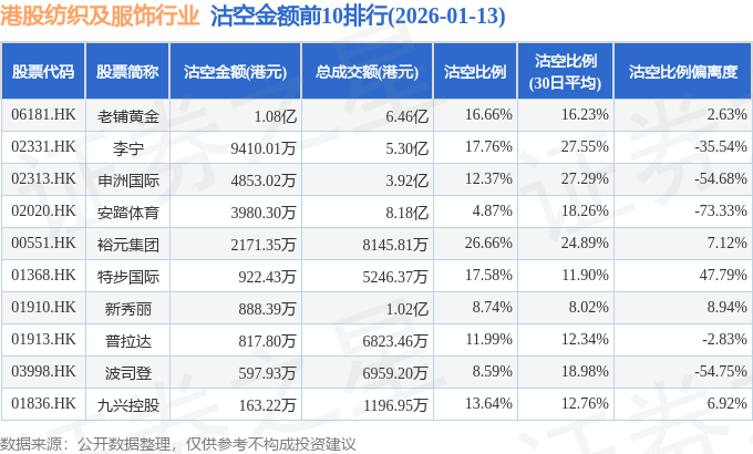 从沽空金额来看,老铺黄金、李宁、申洲国际沽空金额位居行业前三,分别为1.08亿港元、9410.01万港元、4853.02万港元。