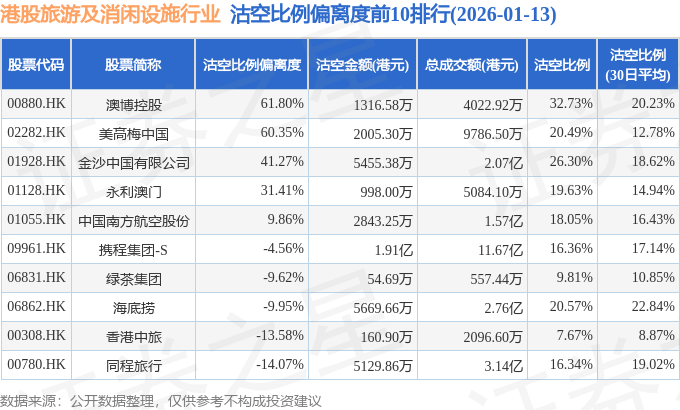 证券之星消息,1月13日港交所披露数据显示,当日港股旅游及消闲设施行业的137只个股中有34只被沽空,总沽空股数为3734.59万股,总沽空金额为5.82亿元(港元),而当日旅游及消闲设施行业的总成交金额为41.45亿元(港元),沽空比例为14.04%。当日旅游及消闲设施行业总体跌0.03%。