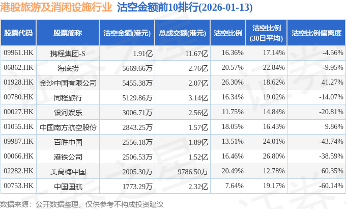 从沽空金额来看,携程集团-S、海底捞、金沙中国有限公司沽空金额位居行业前三,分别为1.91亿港元、5669.66万港元、5455.38万港元。