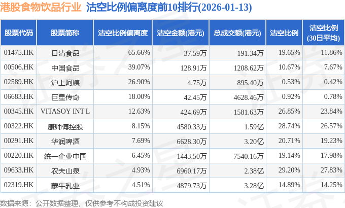 从沽空比例偏离度来看,日清食品、中国食品、沪上阿姨沽空比例偏离度位居行业前三,分别为65.66%、39.07%、26.9%。
