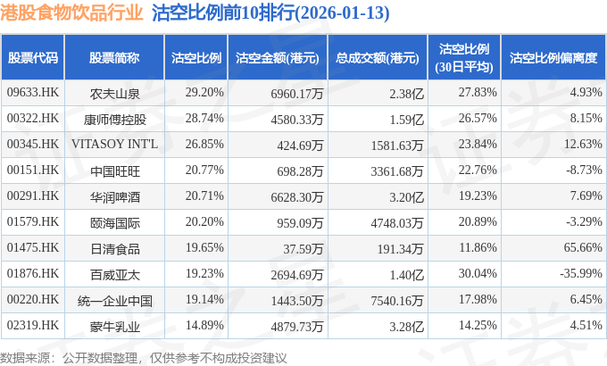 从沽空比例来看,农夫山泉、康师傅控股、VITASOY INT'L沽空比例位居行业前三,分别为29.2%、28.74%、26.85%。