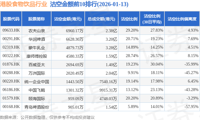 证券之星消息,1月13日港交所披露数据显示,当日港股食物饮品行业的97只个股中有37只被沽空,总沽空股数为3373.37万股,总沽空金额为3.85亿元(港元),而当日食物饮品行业的总成交金额为28.15亿元(港元),沽空比例为13.67%。当日食物饮品行业总体跌0.57%。