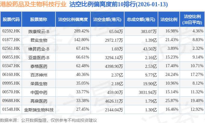 从沽空比例偏离度来看,拨康视云-B、君实生物、维昇药业-B沽空比例偏离度位居行业前三,分别为289.42%、142.8%、67.41%。