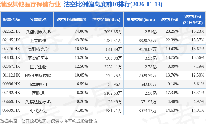 从沽空比例偏离度来看,微创机器人-B、上美股份、康耐特光学沽空比例偏离度位居行业前三,分别为74.06%、43.78%、16.53%。