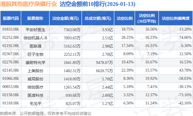 从沽空金额来看,平安好医生、微创机器人-B、医脉通沽空金额位居行业前三,分别为7363.08万港元、7093.65万港元、5162.63万港元。