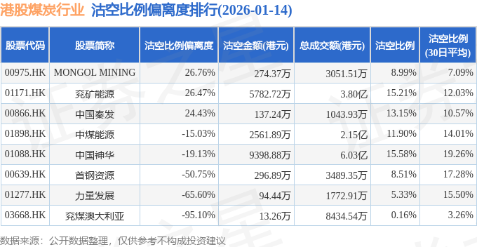 从沽空比例偏离度来看,MONGOL MINING、兖矿能源、中国秦发沽空比例偏离度位居行业前三,分别为26.76%、26.47%、24.43%。