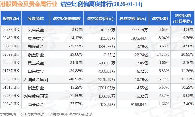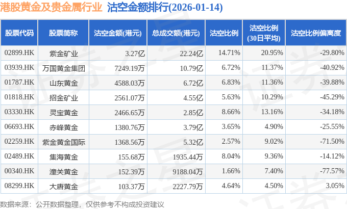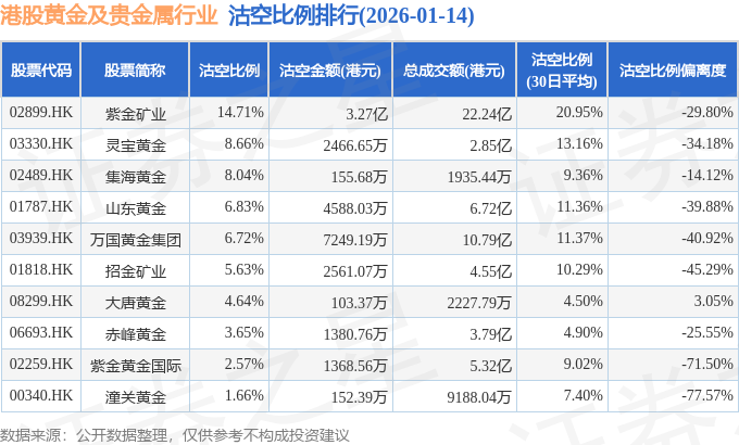 从沽空金额来看,紫金矿业、万国黄金集团、山东黄金沽空金额位居行业前三,分别为3.27亿港元、7249.19万港元、4588.03万港元。