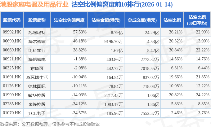从沽空金额来看,泡泡玛特、创科实业、海尔智家沽空金额位居行业前三,分别为8.79亿港元、1.67亿港元、9196.7万港元。