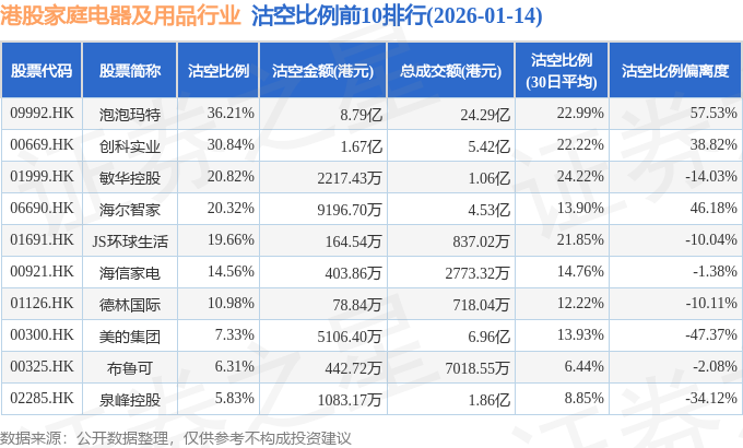 由于港股人民币柜台交易股票成交金额较小,沽空比例普遍偏高,为了避免干扰,已将人民币柜台交易股票从排行表格中剔除。