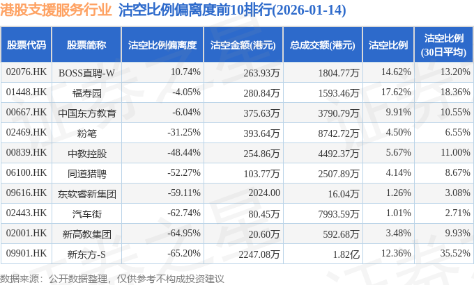 从沽空比例偏离度来看,BOSS直聘-W、福寿园、中国东方教育沽空比例偏离度位居行业前三,分别为10.74%、-4.05%、-6.04%。
