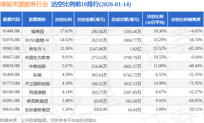 从沽空比例来看,福寿园、BOSS直聘-W、新东方-S沽空比例位居行业前三,分别为17.62%、14.62%、12.36%。