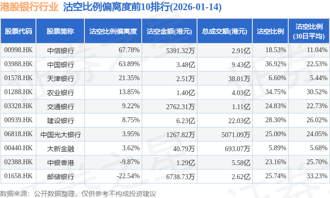 从沽空比例偏离度来看,中信银行、中国银行、天津银行沽空比例偏离度位居行业前三,分别为67.78%、63.89%、21.35%。