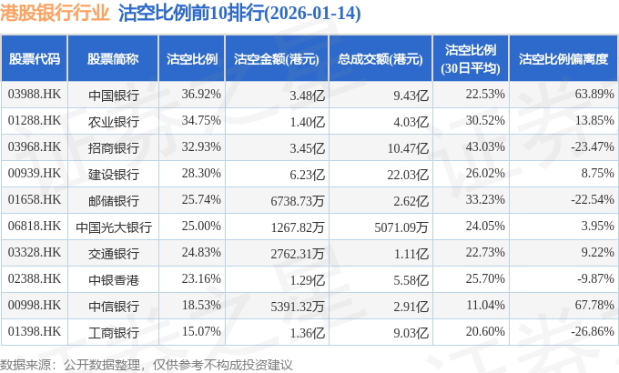 由于港股人民币柜台交易股票成交金额较小,沽空比例普遍偏高,为了避免干扰,已将人民币柜台交易股票从排行表格中剔除。