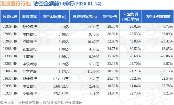 从沽空金额来看,建设银行、中国银行、招商银行沽空金额位居行业前三,分别为6.23亿港元、3.48亿港元、3.45亿港元。