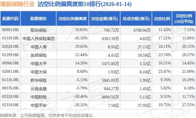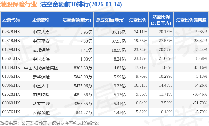 从沽空金额来看,中国人寿、中国平安、友邦保险沽空金额位居行业前三,分别为8.95亿港元、7.5亿港元、4.41亿港元。