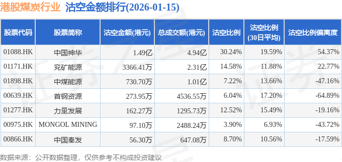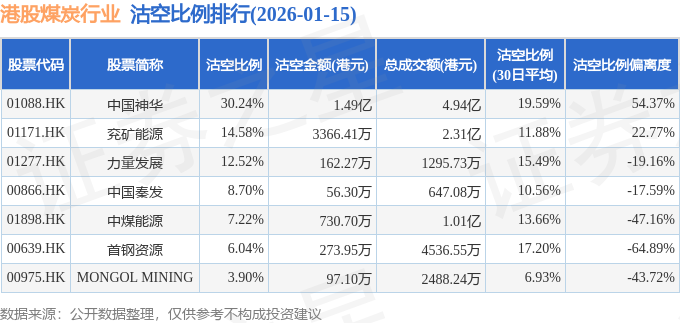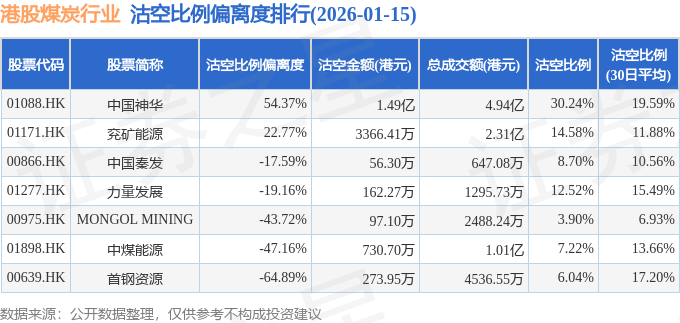 从沽空比例偏离度来看,中国神华、兖矿能源、中国秦发沽空比例偏离度位居行业前三,分别为54.37%、22.77%、-17.59%。