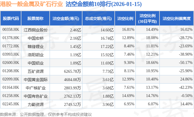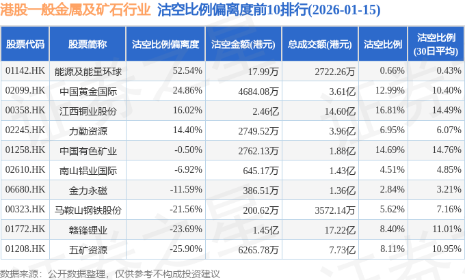 从沽空比例偏离度来看,能源及能量环球、中国黄金国际、江西铜业股份沽空比例偏离度位居行业前三,分别为52.54%、24.86%、16.02%。