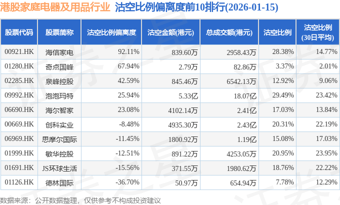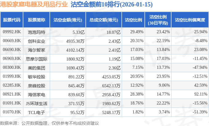 从沽空比例来看,泡泡玛特、海信家电、敏华控股沽空比例位居行业前三,分别为29.49%、28.38%、20.95%。