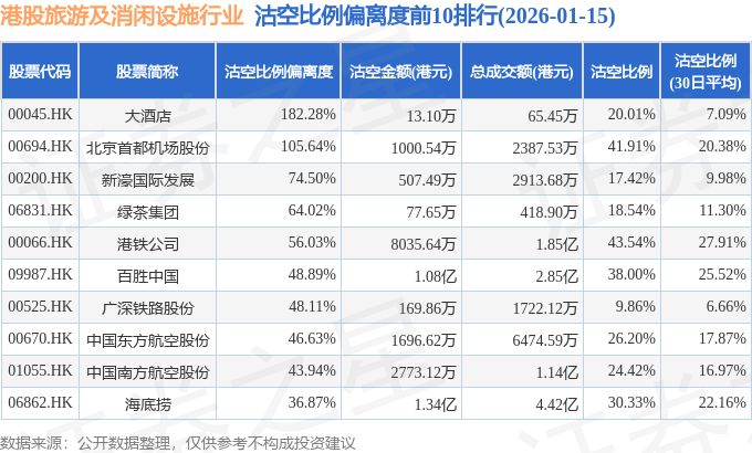 从沽空比例偏离度来看,大酒店、北京首都机场股份、新濠国际发展沽空比例偏离度位居行业前三,分别为182.28%、105.64%、74.5%。