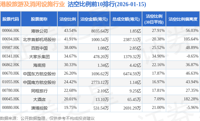 从沽空比例来看,港铁公司、北京首都机场股份、百胜中国沽空比例位居行业前三,分别为43.54%、41.91%、38%。