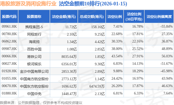 从沽空金额来看,携程集团-S、同程旅行、海底捞沽空金额位居行业前三,分别为11.72亿港元、2.1亿港元、1.34亿港元。