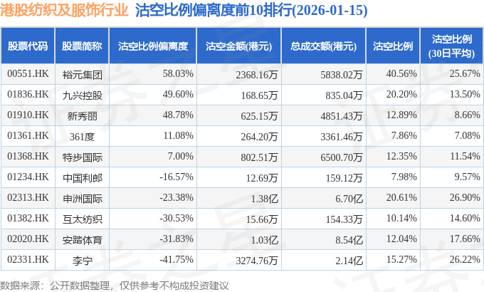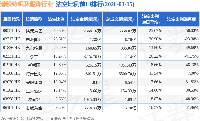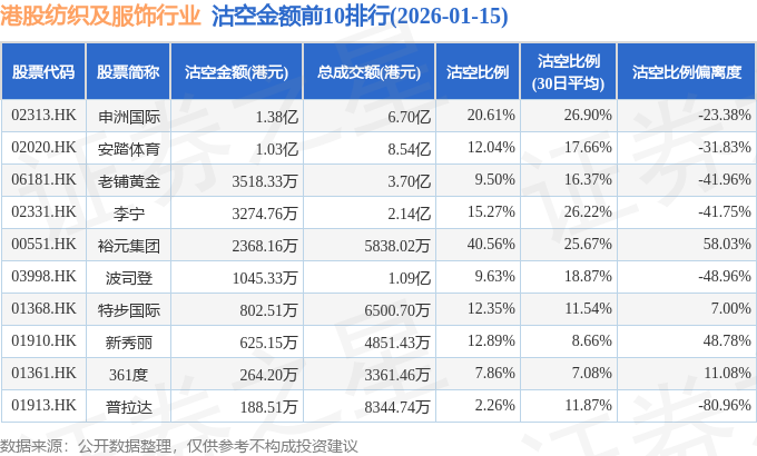从沽空金额来看,申洲国际、安踏体育、老铺黄金沽空金额位居行业前三,分别为1.38亿港元、1.03亿港元、3518.33万港元。