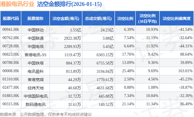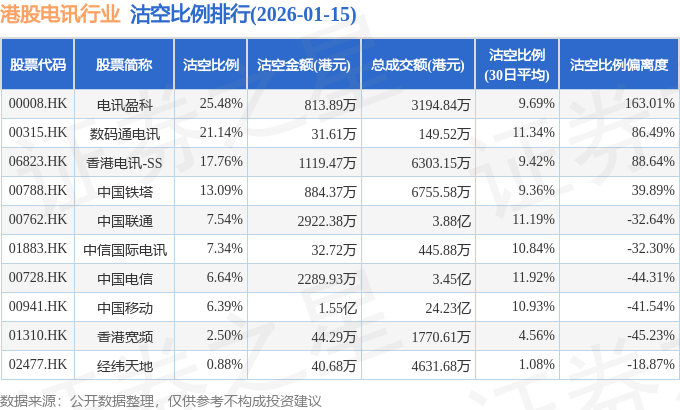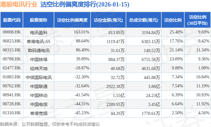 从沽空比例偏离度来看,电讯盈科、香港电讯-SS、数码通电讯沽空比例偏离度位居行业前三,分别为163.01%、88.64%、86.49%。