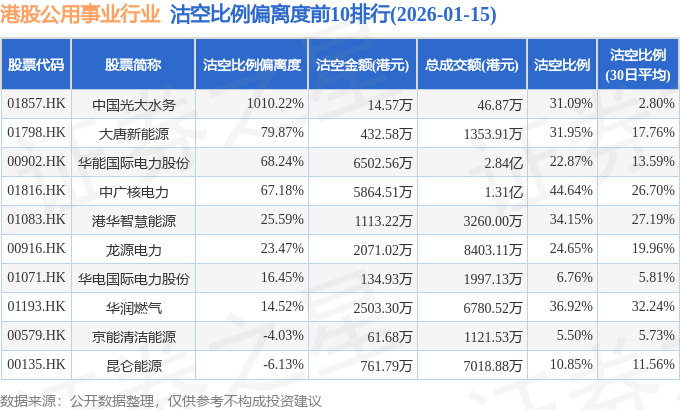 从沽空比例偏离度来看,中国光大水务、大唐新能源、华能国际电力股份沽空比例偏离度位居行业前三,分别为1010.22%、79.87%、68.24%。