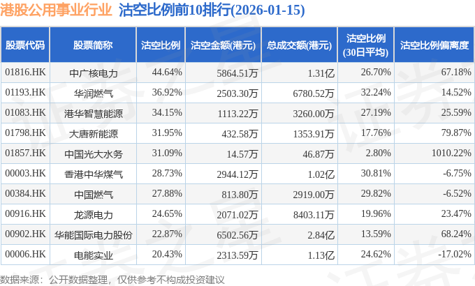 从沽空比例来看,中广核电力、华润燃气、港华智慧能源沽空比例位居行业前三,分别为44.64%、36.92%、34.15%。