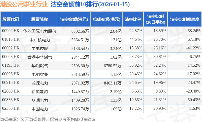 从沽空金额来看,华能国际电力股份、中广核电力、中电控股沽空金额位居行业前三,分别为6502.56万港元、5864.51万港元、5136.54万港元。