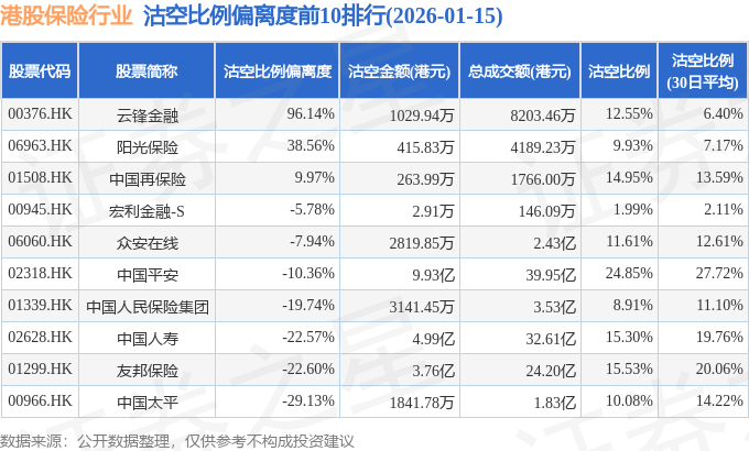 从沽空比例偏离度来看,云锋金融、阳光保险、中国再保险沽空比例偏离度位居行业前三,分别为96.14%、38.56%、9.97%。