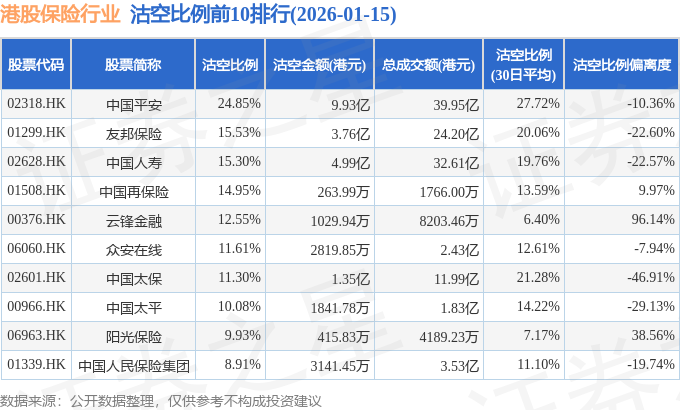 从沽空比例来看,中国平安、友邦保险、中国人寿沽空比例位居行业前三,分别为24.85%、15.53%、15.3%。