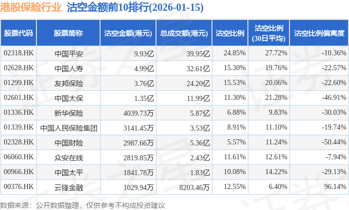 从沽空金额来看,中国平安、中国人寿、友邦保险沽空金额位居行业前三,分别为9.93亿港元、4.99亿港元、3.76亿港元。