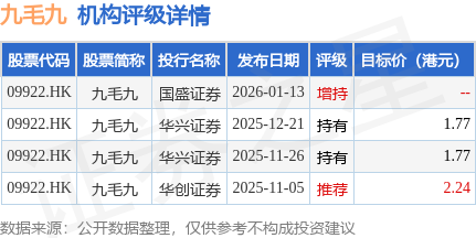 截至2026年1月16日收盘,九毛九(09922.HK)报收于2.02港元,与上一交易日持平,成交量328.75万股,成交额667.35万港元。投行对该股的评级以持有为主,近90天内共有2家投行给出持有评级,近90天的目标均价为1.93港元。国盛证券最新一份研报给予九毛九增持评级。
