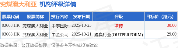 截至2026年1月19日收盘,兖煤澳大利亚(03668.HK)报收于28.28港元,上涨1.14%,成交量118.52万股,成交额3351.16万港元。投行对该股的评级以跑赢行业(OUTPERFORM)为主,近90天内共有1家投行给出跑赢行业(OUTPERFORM)评级,近90天的目标均价为29.5港元。中泰国际最新一份研报给予兖煤澳大利亚增持评级,目标价30港元。