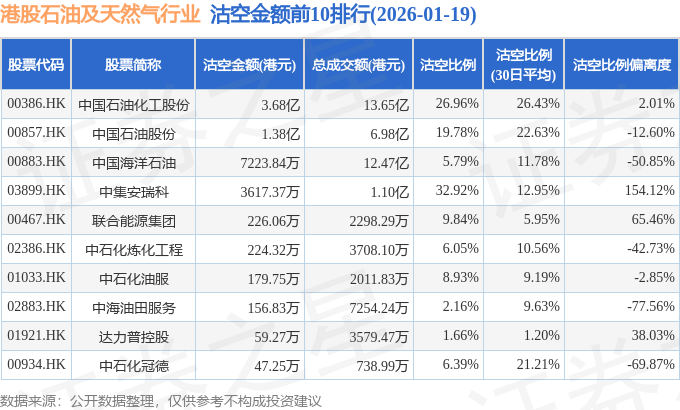从沽空金额来看,中国石油化工股份、中国石油股份、中国海洋石油沽空金额位居行业前三,分别为3.68亿港元、1.38亿港元、7223.84万港元。
