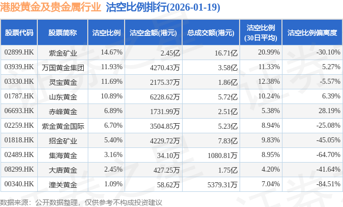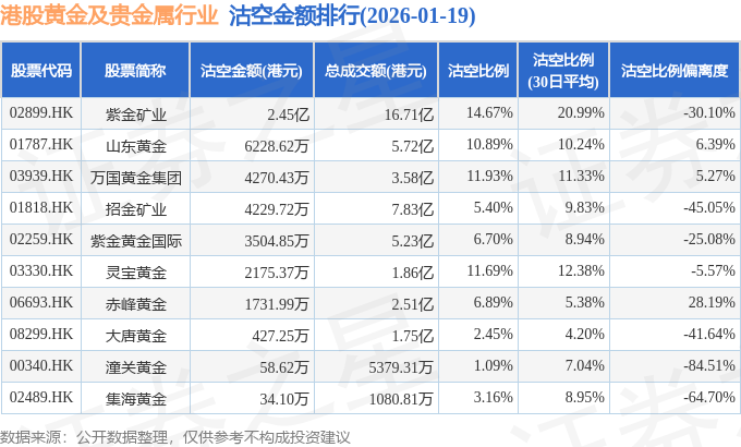 从沽空金额来看,紫金矿业、山东黄金、万国黄金集团沽空金额位居行业前三,分别为2.45亿港元、6228.62万港元、4270.43万港元。