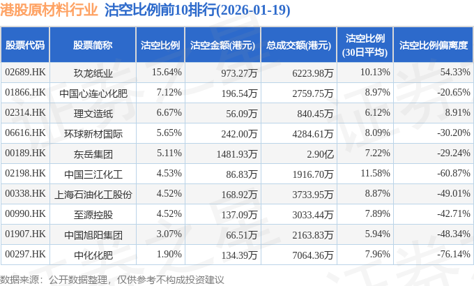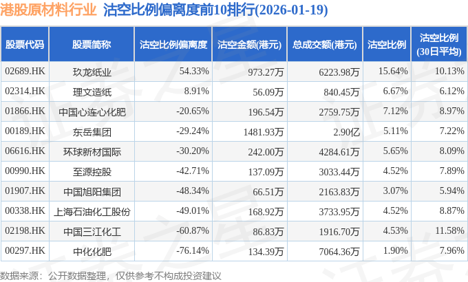 从沽空比例来看,玖龙纸业、中国心连心化肥、理文造纸沽空比例位居行业前三,分别为15.64%、7.12%、6.67%。