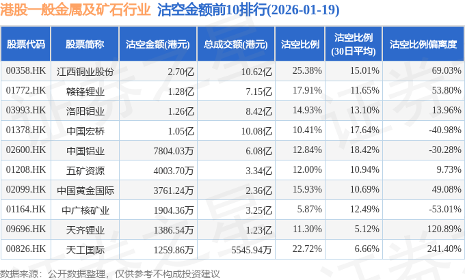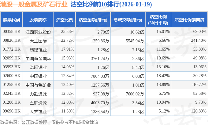 从沽空比例来看,江西铜业股份、天工国际、赣锋锂业沽空比例位居行业前三,分别为25.38%、22.72%、17.91%。