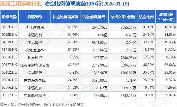 从沽空比例偏离度来看,浙江沪杭甬、中远海能、中远海控沽空比例偏离度位居行业前三,分别为69.99%、65.4%、65.3%。