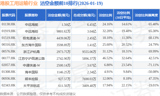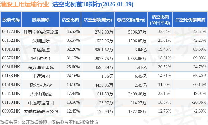从沽空金额来看,中远海能、中远海控、极兔速递-W沽空金额位居行业前三,分别为1.56亿港元、9801.62万港元、4439.06万港元。